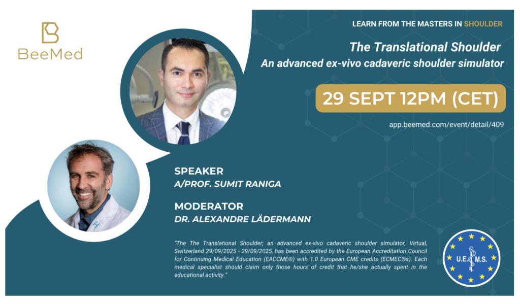 The session, announced by BeeMed as part of its series called Learn from the Masters in Shoulder, featured A/Prof Raniga’s presentation “The Translational Shoulder: an advanced ex-vivo cadaveric shoulder simulator.”